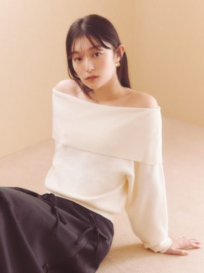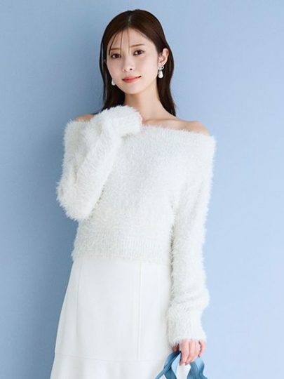 ふわふわのフェザーヤーンで編み上げたシンプルなオフショルダーのニットプルオーバー。シルバーのラメが煌めくアイボリーは、さりげなく洒落感が漂うイチオシ。少し短めの丈は、様々なシルエットのスカートやワイドパンツとも好相性。ヘルシーで大人な印象を演出します。