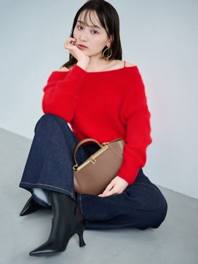 フォックス85%・アルパカ15%、とリュクスな天然素材を使用したオフショルニット。起毛感を出してふんわりと仕上げた生地は、軽やかで肌触りが良く、コーディネートを品よく演出。ややドルマンっぽい袖がルーズな雰囲気で、ワンショルにしたり、オフショルにしたり、リラックス感のあるシルエットを楽しめます。