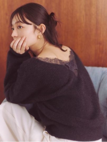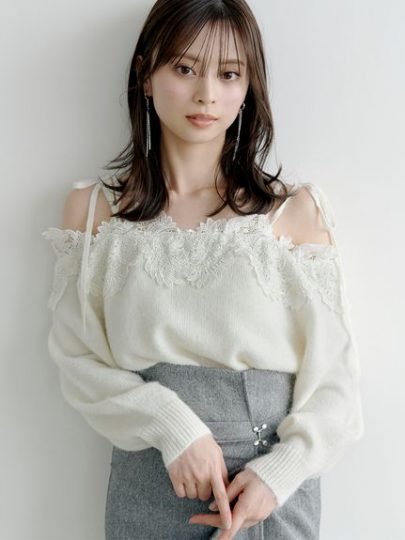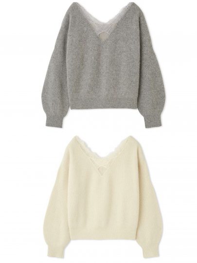 ふんわりとした肌触りのニットは、前後Vネックに繊細なレースをトリミング。バックスタイルには光沢感のあるオーガンジーもプラスし、ほんのり肌が透けるデザイン性で、