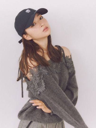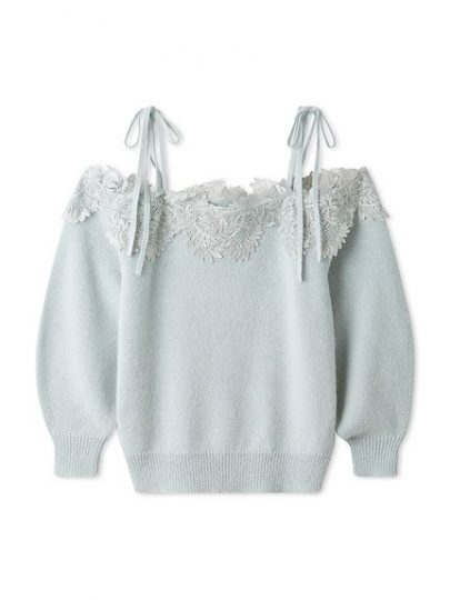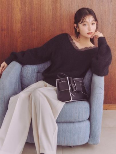 オフショルダーニットの襟ぐりに、スカラップレースをドッキングしてアップデート! 肩紐がリボンディテールなところもたまらない。顔まわりを華やかに盛り上げてくれます。起毛感のあるニットのやわらかな表情と、レースの組み合わせが洒落感たっぷり。