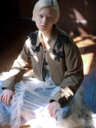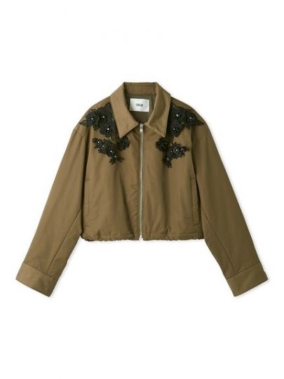 シンプルなデザインに肩から胸元にかけてレースやビジューを施した、華やかなブルゾン。ショート丈シャツディテールに、アクセントのあるデザインが自慢。全体に中綿が入っているため防寒性も高く、長く愛用できるはず。