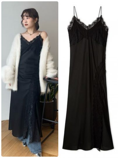 レースでトリミングしたVネックと、裾のスリットがスタイリッシュなサテンスリップドレス。落ち感があって柔らかいけれど、しっかりと厚みもあるサテン生地を使っているから、ニットなど冬素材のアイテムとのレイヤードにもぴったり。スリットにあしらったレースのトリミングは、パンツやブーツと合わせたときに効果的!