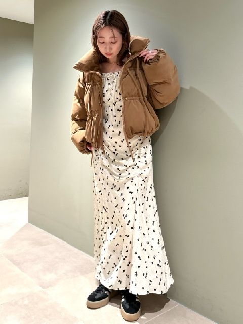 もこもことした生地がかわいいキャメルのジャケット。トレンドのクロップド丈なので、ロングワンピースとの相性抜群です。足元はブラックのスニーカーにすることで、ガーリーすぎずこなれた印象になります。