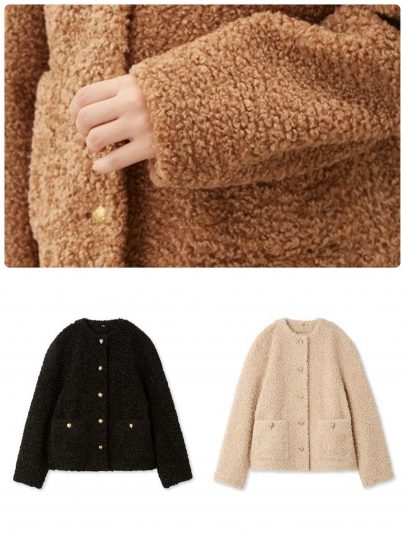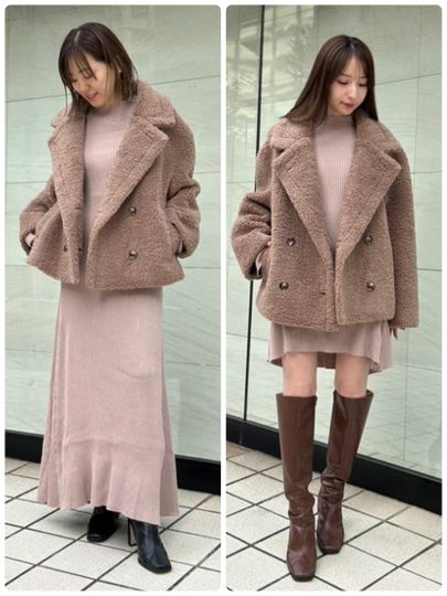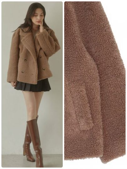 ショート丈のボアコートは、大きめの襟で“防寒+小顔効果”がしっかりあるのも嬉しいポイント。また、襟元に隠しボタンがついていて、寒い日には襟を立ててスタンドカラーにしても着用できる優れもの。裏地はボンディング仕上げでアウター自体の防寒・保温性に優れているため、寒い日にもインナーをたくさん着込むことなく着こなせます。