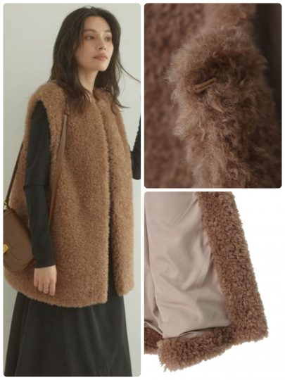ふわふわ毛足のある軽いボア素材のジレは、着丈が長すぎず、短すぎないのでどんなボトムスにも合わせやすくて、この時期にぴったり。デニムやパンツスタイルでカジュアルに合わせるのはもちろん、ワンピースやロングスカートなどフェミニンなアイテムと合わせた着こなしもおすすめ。
