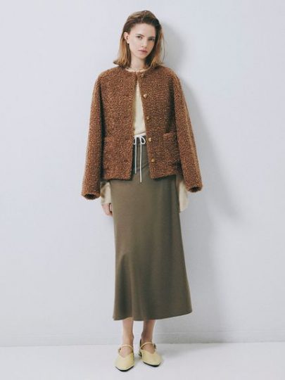 Mila Owenで大人気のノーカラージャケットを、表情豊かなボアの素材を使って、キュートでエレガントな一枚に。金ボタンがリッチで華やかな印象になり、フロントポケットもアクセントに。裏地にはスウェード調の素材を使用し、まるで本物のボアのような高級感を演出。コンパクトめのサイズなので、ボアジャケットなのにスッキリと着用できます。
