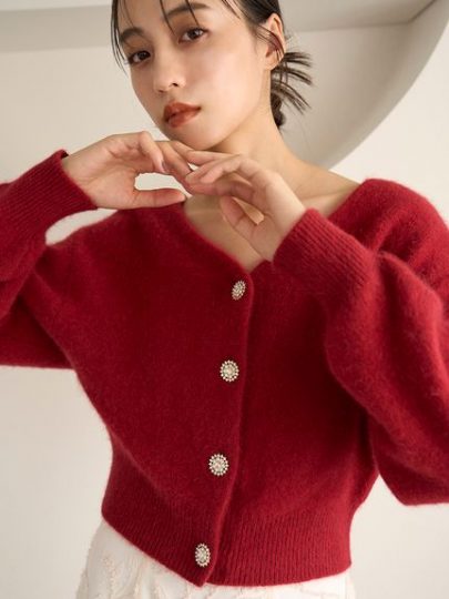 ビジューボタンがコーディネートを格上げする、ふわふわフォックスニットカーディガン。短丈&Vネックで抜け感を出し、女性らしい雰囲気に。コンパクトなシルエットは、キャミソールやワンピースとも相性抜群です。