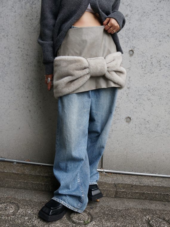 大きなリボンのミニスカートはあえてゆるっとしたデニムと合わせてボーイッシュなスタイルにON。子供っぽくならずこなれたカジュアルな着こなしに。
