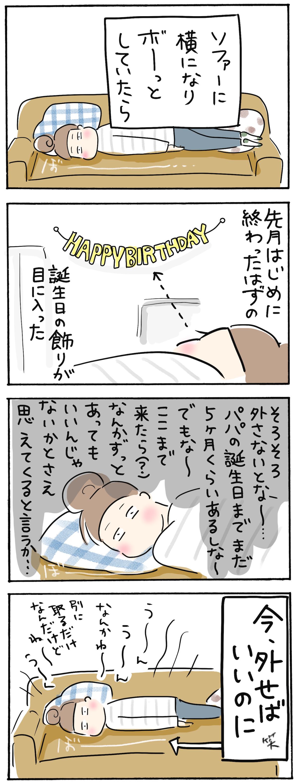 LIFE 2024.11.05 うちのこと。2〜いつまでもお祝い気分?編〜 こんなに簡単なことなのに今出来ない私。 壁に手を伸ばすのがめんどくさい。(重症)今外してしまえばいいのに〜〜!このまま寝転んで終わりました。私の休憩タイム。そしてまだ飾られている「HAPPY BIRTHDAY」。クリスマス前には外そう、、、。笑Tweet Tag : ズボラ 主婦 主婦漫画