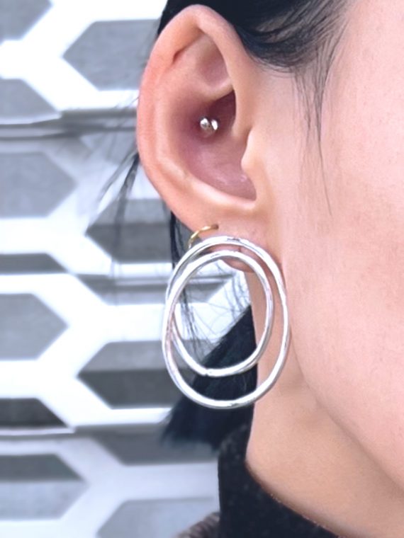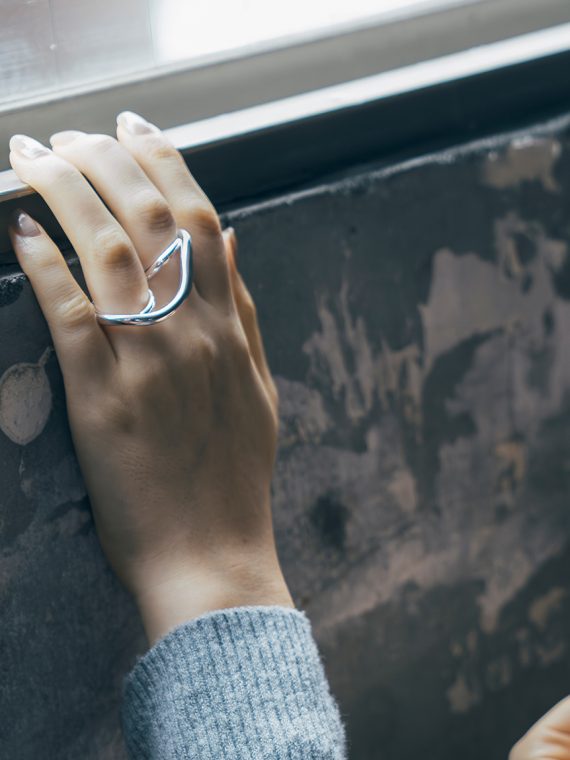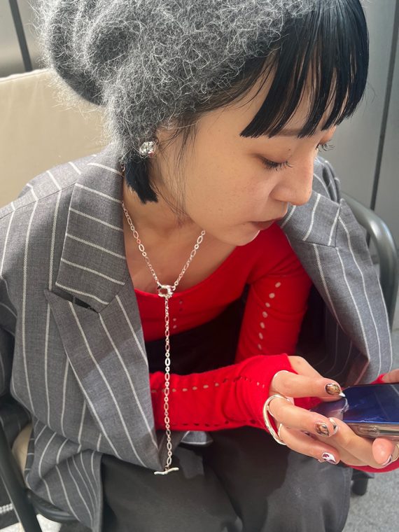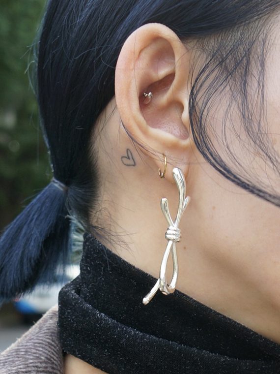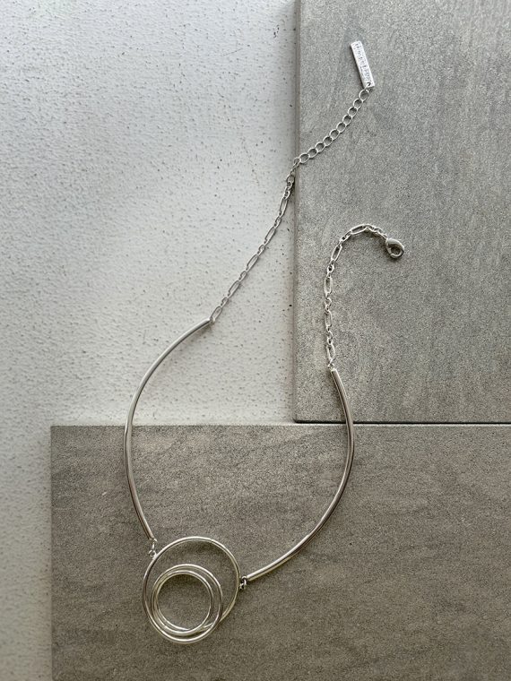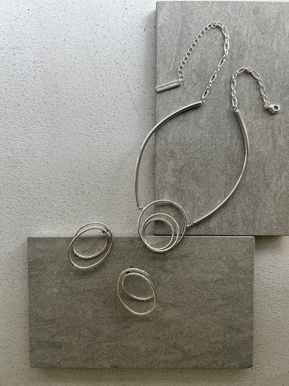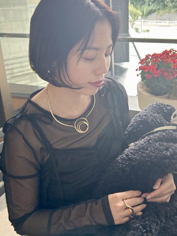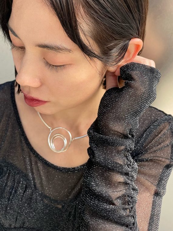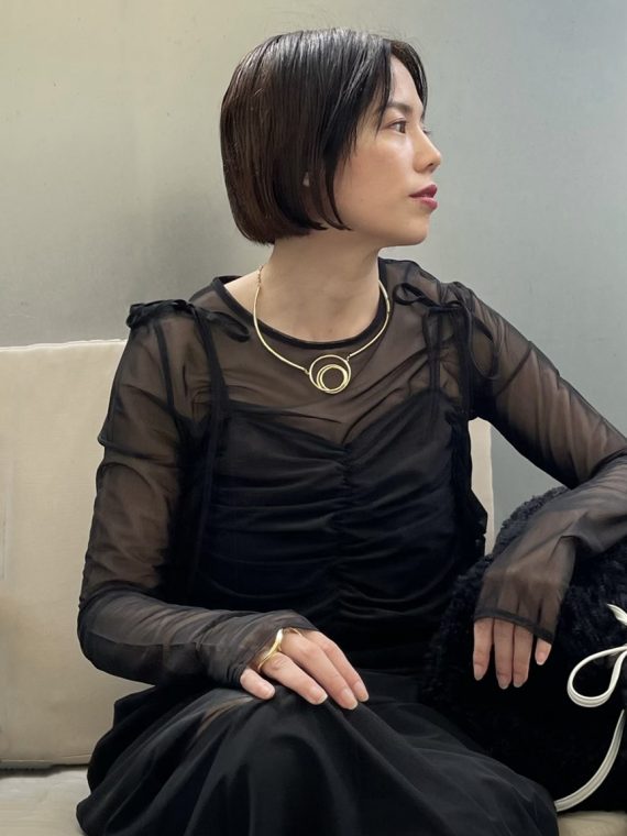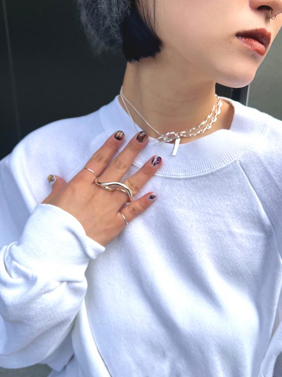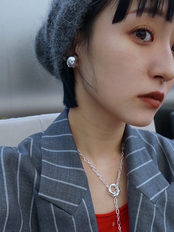 とある週末は芸術の秋ということで美術館に行きました。かっちりとしたデザイン性のあるアイテムに、Knotting シリーズのネックレスとリングをプラス。メンズライクになりすぎないようアクセントを添えました。私はピアスホールが開いてないのでつけていませんが、同シリーズのピアスもあります。