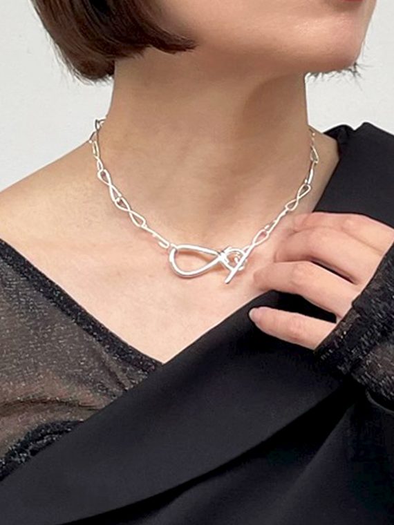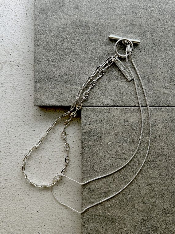 アンカーチェーン×スネークチェーンと異なる2種のチェーンを絡めたデザインチョーカー。短めの作りなのでクルーネックのトップスとバランスよく身に着けられます。スウェットなどカジュアルな装いからモードでかっちりした系統まで幅広くマッチ。