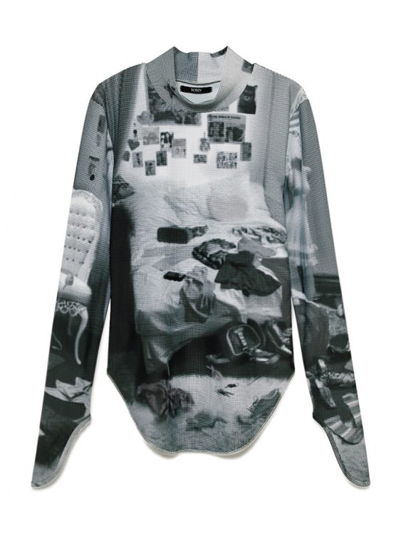 前後身頃、袖、襟といった各パーツに異なる柄を配置したパネルプリントで、遊び心あふれるデザインに仕上げています。タートルネックのシンプルさに加え、袖口と裾のSORINらしいカーブデザインが個性をさりげなく演出。