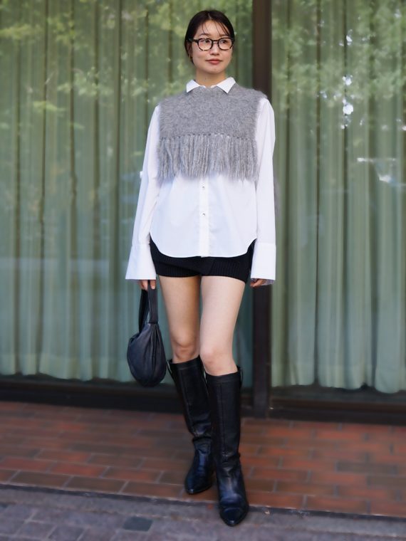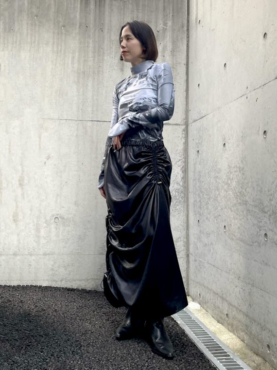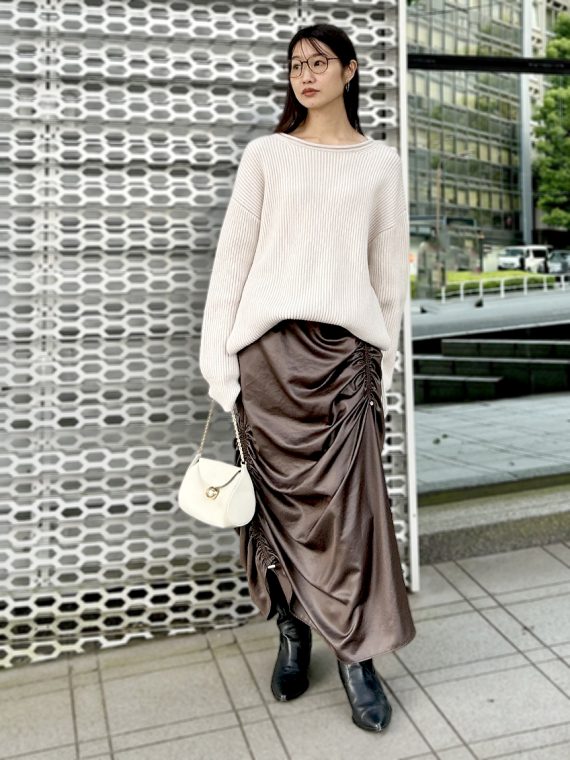 シンプルなデザインのトップスを主役に、全体をモノトーンでまとめたコーディネート。トップスのフラットな作りを活かし、ボトムスにはドロスト仕様の立体感あるスカートを選ぶことで、全体に動きと奥行きをプラスしました。