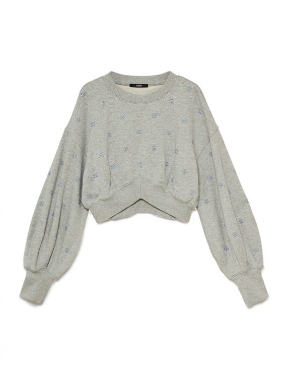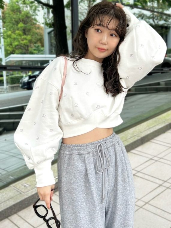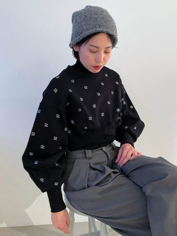 SORINの「S」をモチーフに、ハートにも見えるラインストーン柄が特徴のトップス。クリアな輝きを放つラインストーンが顔周りを明るく華やかに演出します。前裾のカーブカッティングや立体感のあるボリューム袖が、SORINらしい個性をプラス。短丈ながら、ゆとりあるフォルムとドロップショルダーでリラックス感がありつつ、スタイリッシュに着こなせる一枚です。