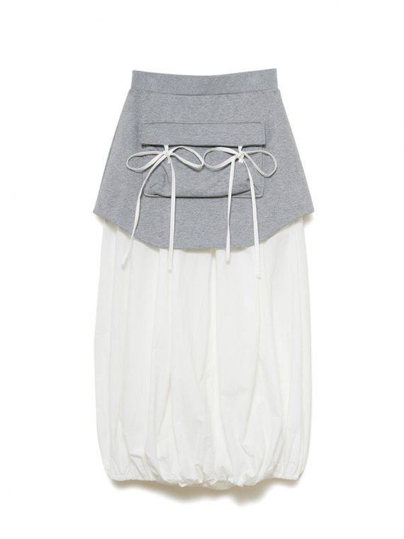 ミニ丈スウェットトップとバルーンスカートのセットアイテム。トップスはベアトップやミニスカートとして使える2WAY仕様。立体的なカーゴポケットとリボン付きフラップがアクセント。スカートはウエストゴムで快適、胸元に上げてチュニックにもアレンジ可能。切り替えを多く取り入れた360°立体シルエットで、裾のゴムが動きやすさをプラス。セットでも単品でも幅広く活躍するアイテムです。