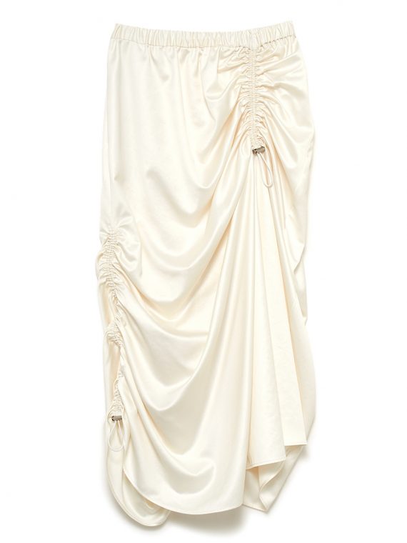 3カ所のドローコードでギャザーを寄せたアシンメトリーデザインが特徴のスカートです。