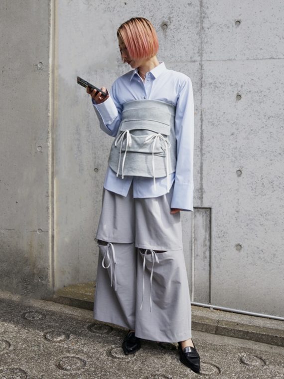 一見シンプルなワイドスリーブシャツながら、バックスタイルはオープン&レースアップデザインが特徴。肩パッド入りのオーバーショルダーが美しいシルエットを作り、肩ラインを引き立てます。お尻が隠れるやや長めの丈感に、メタルボタンがアクセントとなり高級感をプラス。前後で異なる印象を楽しめる、大人の個性派アイテムです。