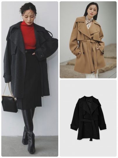 素材の良さを生かしたリバー縫製で軽く仕上げたウールトレンチコート。大きめのエリがアクセントになりコーデがグッと今どきに。ウエストマークをすることで、スタイルアップが叶います。