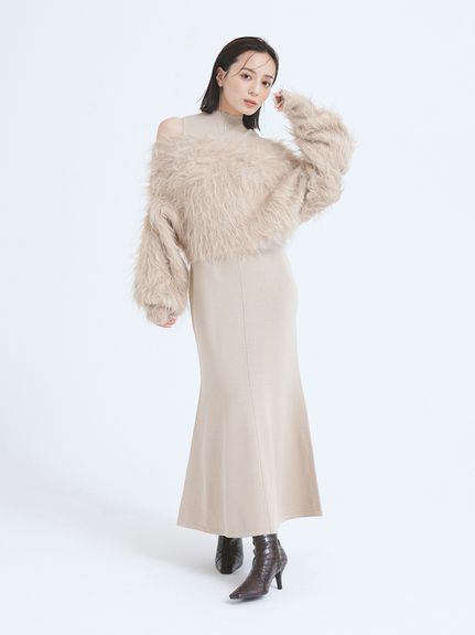こちらは、ふわふわのオフショルトップスと、シンプルなマーメイドシルエットのノースリーブワンピースのセットアイテム。上品な色合いも、モテ女子って感じで好印象。肌見せのチラリ具合も程よい。【USAGI ONLINE限定カラー】【セットアイテム】オフショルレイヤードニットワンピース/アニュアンス