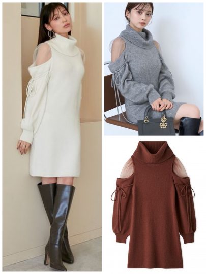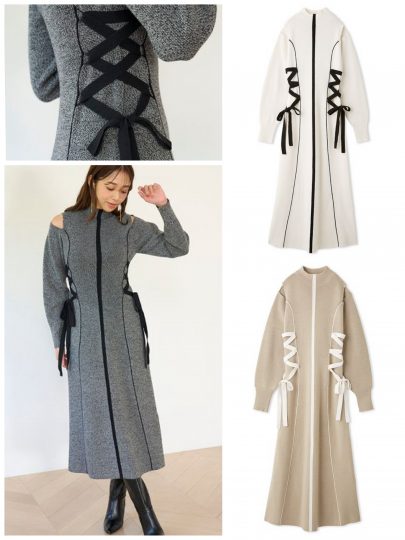 両サイドを編み上げたリボンなど、バイカラーでメリハリをつけたニットワンピ。肩先だけを覗かせたカットアウトで、上品な肌見せが叶います。