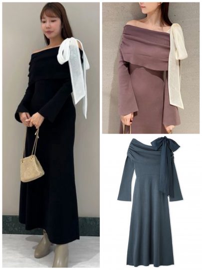ワンショルダーリボンニットワンピース