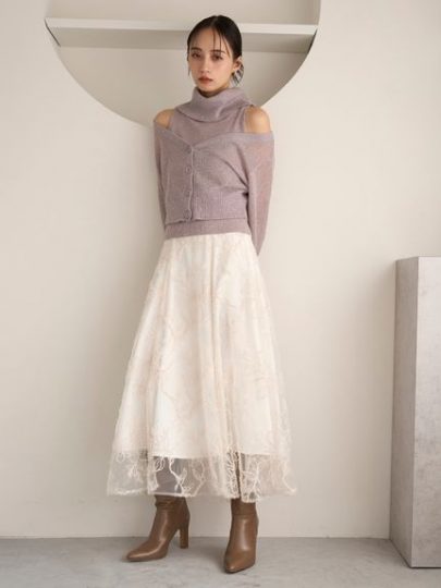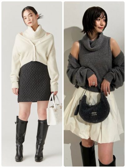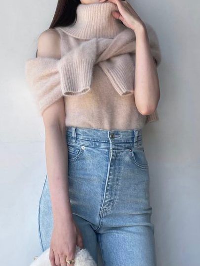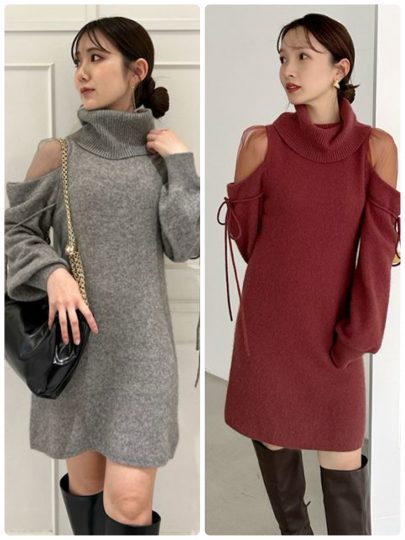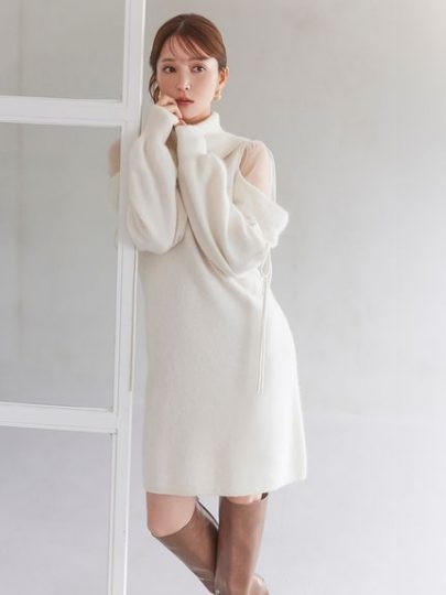 ボリュームタートルのキレイめなニットワンピながら、大胆なショルダーカットにオーガンジーを配した女性らしさを高めてくれるデザインです。すっきりとしたIラインシルエットにはブーツを合わせて、デートにぴったりなコーデが完成。