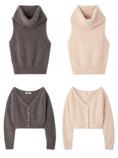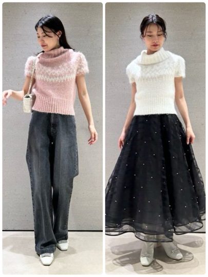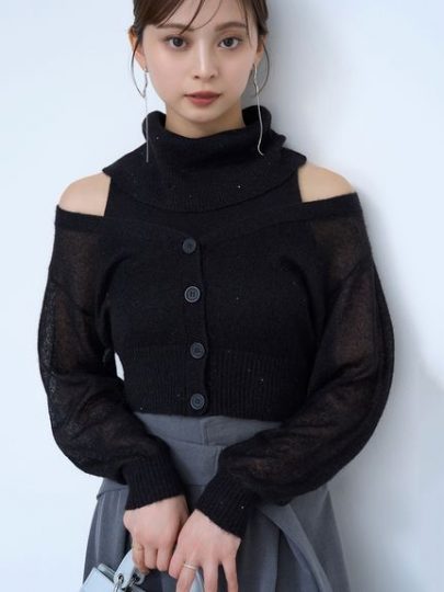 アメスリニットトップスとニットカーディガンのアンサンブル。ボリュームを出して顔周りを華やかに仕上げたトップスは、ふんわりハイゲージ編み。カーディガンは編み地を変えて極小のスパンコールを散りばめて、キラキラと大人の輝きをプラス。短丈だからセットで着用しても軽やかさが出せます。