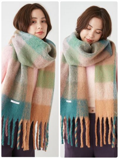 ボリューム感とカラフルブロックがかわいい大判マフラー。マフラーとして巻くほか、ストールとしてもいい仕事をしてくれます!重くなりがちな冬コーデの差し色としても活躍しそう。小顔効果はもちろんのことながら、顔まわりをパッと華やかに見せてくれるのも◎。