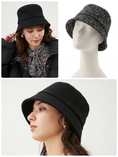 顔の面積が自然に現象するバケハは、小顔を目指すなら欠かせないアイテムのひとつ。カジュアルなイメージが強いアイテムですが、こちらは高級感のあるツイード素材を使って女性らしさをトッピング。