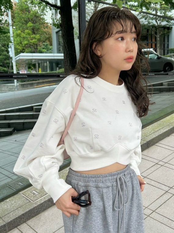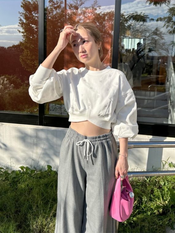 春まで着られるホワイト地にキラリと輝くライトピンクのラインストーンが魅力的なスウェットトップス。特別感あふれる1枚を、モデル撮りおろし&スタッフコーデのLOOK BOOKでご紹介!