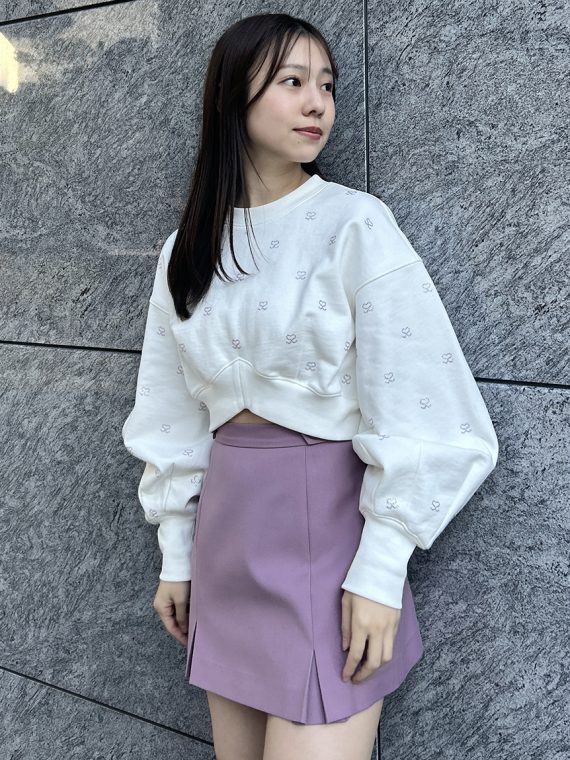 ミニ丈のスウェットにミニスカートを合わせた低身長さん向きコーディネート。私はスカートとストーンのピンクをリンクさせました♪ミニマムな作りに対して袖のシルエットが立体的&ボリューミィーでカワイイ!