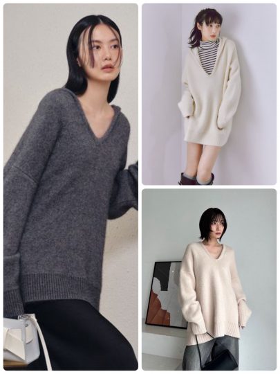 ゆるっとカジュアルなシルエットですが、深めのVネック仕立てで女性らしさ満点。また丸みのあるシルエットとお尻が隠れるほどのロング丈で、体型カバーも叶います。