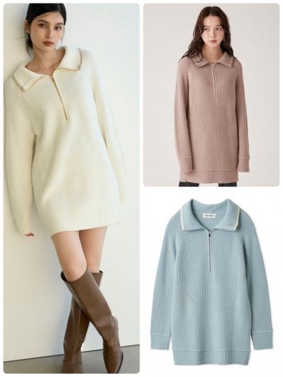ゆるめのシルエットが特徴のニットワンピース。より女性らしさを高めたいときは、フロントのジップを下げてオフショルとして着用するのがおすすめです。トップスとして着こなす場合は、ロングスカートと好相性。
