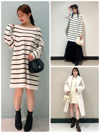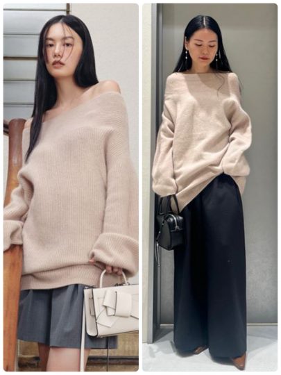 女性らしさ満点のオフショルミニニット