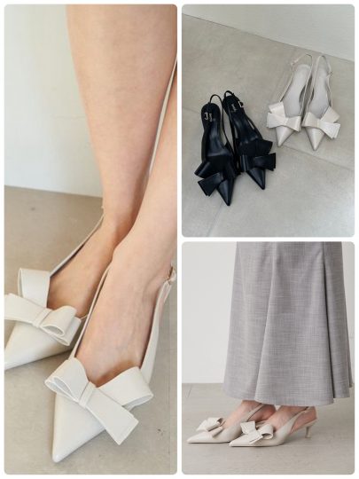 フロントを飾る大きなリボンモチーフが目を引くスリングバックパンプス。シャープに仕上げたつま先のラインがモードな要素もプラスします。