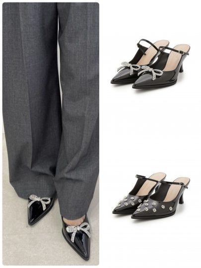 スタンダードな形のミュールに、カラーによって違うパターンのビジューをあしらって華やかに。7cmのピンヒールでスタイルアップも叶えてくれる一足です。
