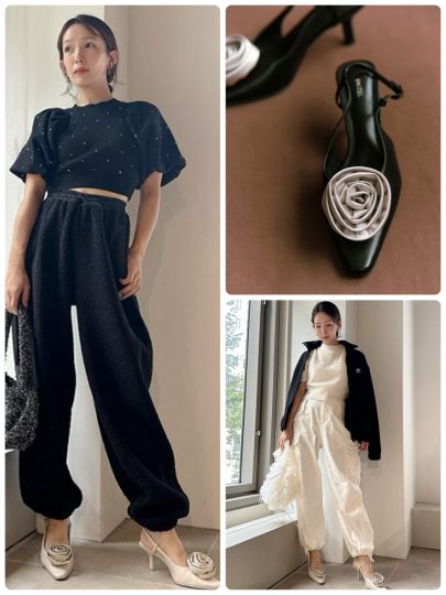 フロントを飾る立体的なローズモチーフが印象的なパンプス。ブラックはアッパー、ローズともにツヤのあるサテン生地、ミックスはアッパーを合皮、ローズをサテン生地、アイボリーはアッパーとローズともに合皮で仕上げています。
