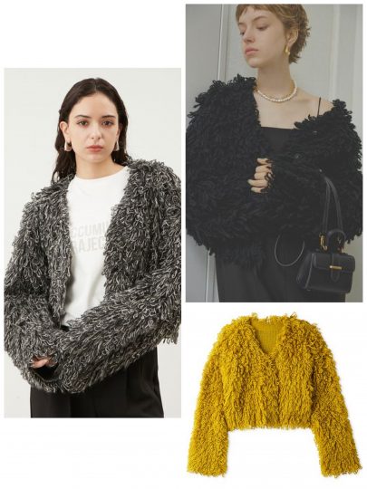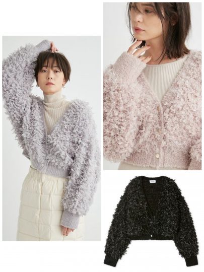 もこもこニット×ラメの煌めきが存在感たっぷり。ショート丈なのでボリューミィでもバランスが取りやすい。
