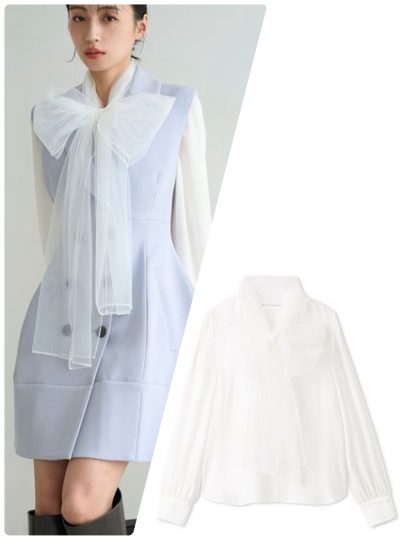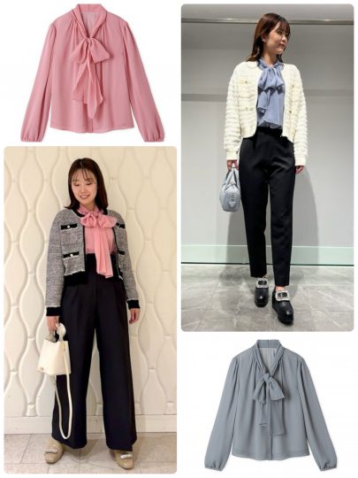 透け感のあるシフォン素材のボウタイは、寒い季節でも快適に着られるように、身頃と袖に軽い裏地が施されています。とくにカーディガンやジャンパースカートとの相性抜群で、リボンを衿元に見せたコーディネートを楽しめます。色は差し色に最適なピンクとサックスがおすすめ。