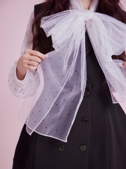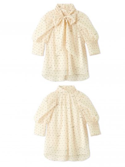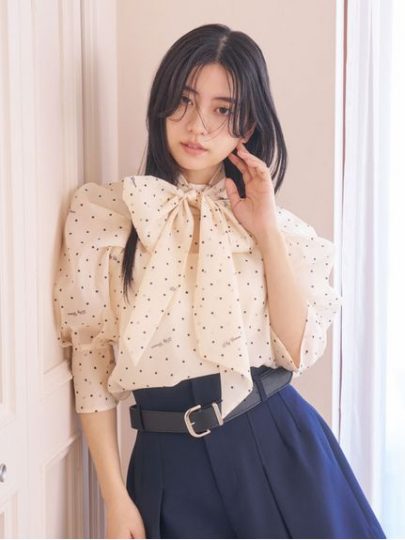 ラグランスリーブで肩のボリュームを抑え、より大人の方も取り入れやすい印象に。構築的なタックのデザインが甘モードに見せてくれます。ボウタイは取り外しができ、タックアウトでもインでも美しく見えるシルエット。イチ推しはロゴを散らしたドット柄。