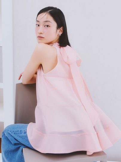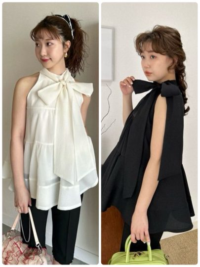 トレンド感溢れるアメリカンスリーブのノースリーブブラウス。身頃はふんわりと広がるティアードデザインで、体型カバーも叶います。ボウタイリボンは前後どちらでも結ぶことができ、その日のコーディネートに合わせてアレンジ可能。サイドで結んでも素敵!