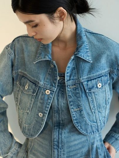 コンパクトなサイジングとボウタイがこなれ感を誘うクロップドデニムジャケット。フロントから裾にかけて緩やかにラウンドしたヘムラインが目新しく、短すぎない絶妙な丈感で、パンツやワンピースどんなボトムスにもしっくり。ボタンを閉めて共布のタイを結べば、ブラウス風にアレンジも可能です。