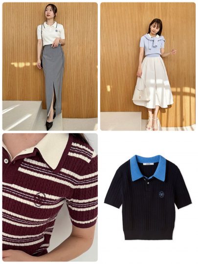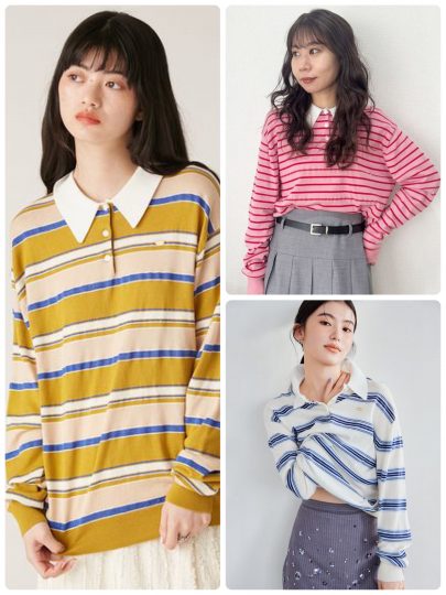 ブルー系のボーダーを配したホワイト、ピンク、マスタードと春らしいカラーを取り揃えたポロニットトップスが登場しました。襟は3色とも共通して白で仕立てて爽やかなムードを演出。