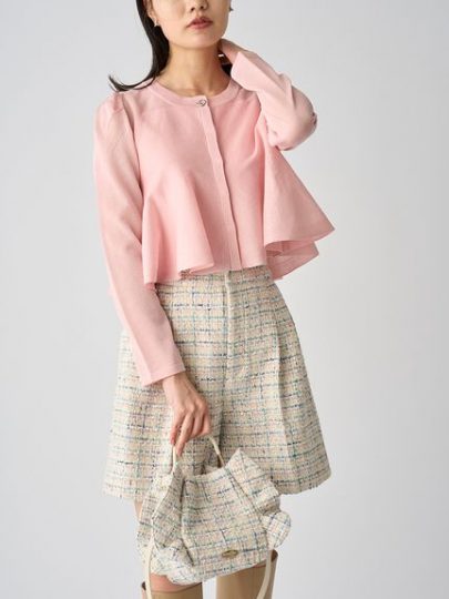 裾に広がるフレアが繊細で美しいフォルムをつくりだすシアーカーディガン。高めの位置からフレアを展開しクロップド丈に設定することで、コンパクトながら1枚で着映えする華やかなデザイン。ニットと同色でインナーキャミソールもセットになっています。