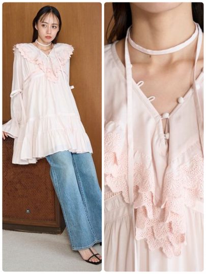 ミニワンピとしてもいける、ラッフルレースカラーが可愛いチュニックブラウスが到着。胸下のレーステープ、襟ぐりのレースカラーとくるみボタンにボタンホールのデザイン、ウエストのリボンデザイン、ギャザーをふんだんに取り入れた、トレンド感満載のアイテムです。さらに今季らしさを加速させる細リボンチョーカーもセットに。