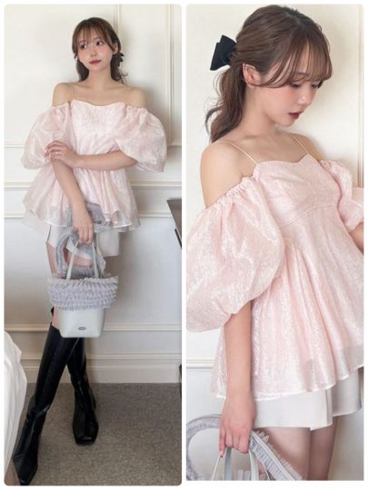 女性らしいボリューム感と程よい肌見せデザインに、シアー素材を取り入れることで軽やかで季節感のある印象に。ボタンで簡単に取り外しができ、パフスリーブ、オフショルダー、キャミソールと3Wayの着こなしが楽しめます。ピンクはWEB限定のカラー。
