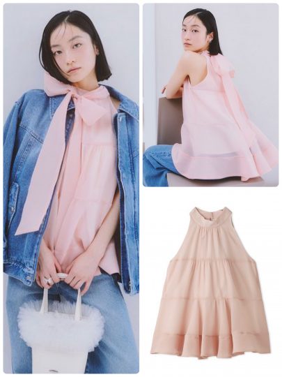 ヘルシーな色香を醸すアメリカンスリーブノースリブラウス。腕周りがすっきりと見え、美しいデコルテラインを引き立てます。身頃はふんわりと広がるティアード型。ボウタイリボンは前後どちらでも結ぶことができ、その日のコーディネートに合わせてアレンジ可能です。