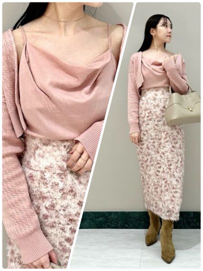 やさしい色味で春気分が高まる、アシンメトリキャミソールとクロップド丈カーディガンのアンサンブルニット。ネックラインをアシンメトリデザインに仕上げ、タックを加えてドレープを利かせた女性らしい仕上がりです。カーディガンは細かめのケーブル編みで短丈にすることで、どんなボトムともバランスがとりやすいシルエットに。
