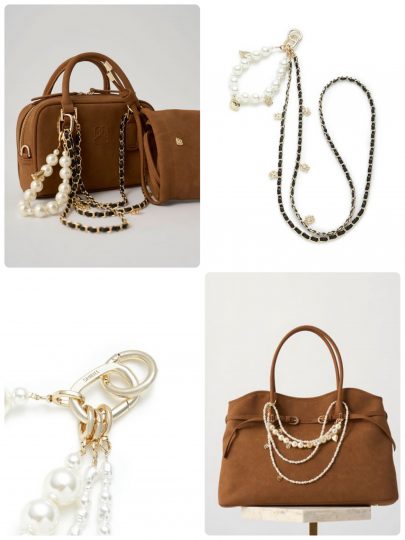 短いストラップ(25㎝サイズ)は大粒のパールビーズ、長いストラップ(115㎝サイズ)にはチェーン・パール・ビジューをあしらったセットアイテム。