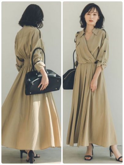 トレンチコートのディテールを落とし込んだワンピース。肩章やスコッチ釦がアクセントになりながらも、カシュクールの抜け感や裾に広がるスカートのシルエットが女らしいニュアンスに。柔らかさと落ち感のある生地感もエレガント。